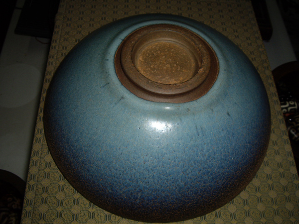 口微斂,弧形腹壁, 圈足。器物內外施天藍釉,外壁釉不到底,碗口沿釉薄處呈醬色,足素胎無釉。此碗胎體厚重,釉汁凝重,具有元代鈞窯器的諸多特徵。
